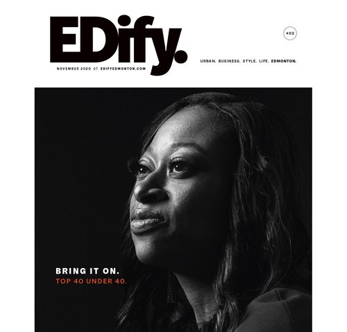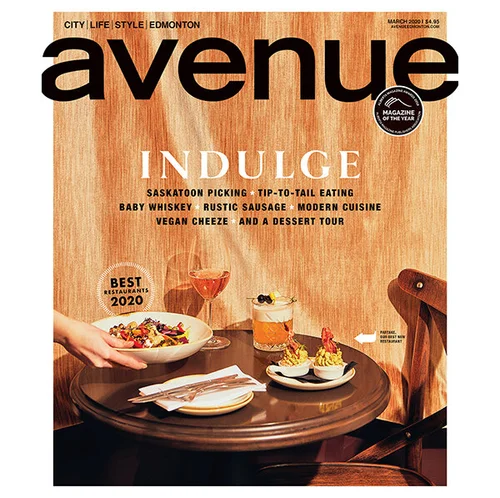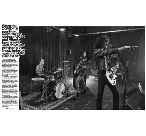 Gaucher scouted locations and determined that the roof of the two-storey Art Central building, at Centre Street and Seventh Ave. SE, was the best bet. With the permission of the building’s owners, Allied Properties REIT, Gaucher climbed an emergency ladder (with Larson and Gaucher’s assistant, Connor McCord) to the roof at about 8 p.m. It was Thursday, July 25, so the days were still long. Gaucher says the shoot had to take place around dusk. “You want to wait until the surrounding environmental light level is similar to what is going to come out of the building when the lights are on, so you set up and shoot over a period of time until the two match up.”